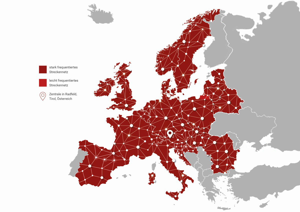 Unser Hauptsitz in Radfeld, Tirol und unser Nebensitz in Salzburg sind strategisch günstig im Herzen Europas, was uns ermöglicht, schnelle und effiziente Transporte in alle Richtungen zu steuern. Mit einem breit aufgestellten stark frequentierten Streckennetz und flexiblen Verbindungen bedienen wir sowohl zentrale als auch weniger stark frequentierte Regionen.